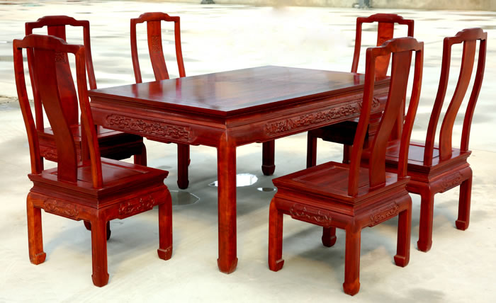 江蘇中尊木業有限公司餐廳系列產品:如意七件套如意餐枱、如意餐椅,餐廳十一件套富貴圓桌、富貴餐椅等。