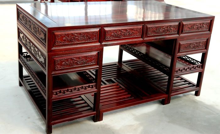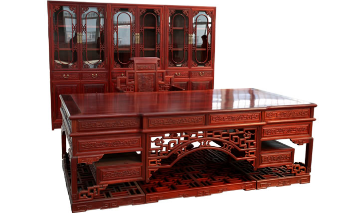 江蘇中尊木業有限公司書房系列產品:書房五件套草龍書柜、草龍大班枱、卷書寶座椅,洋花寫字枱等。