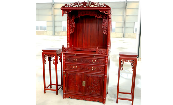 江蘇中尊木業有限公司臥室系列產品:佛光普照大佛龕,臥房四件套富貴大床、富貴大床床邊柜、四門衣柜等。