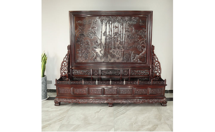 江蘇中尊木業有限公司屏風系列產品:梅蘭竹匊掛屏、四季花折屏四件套等。